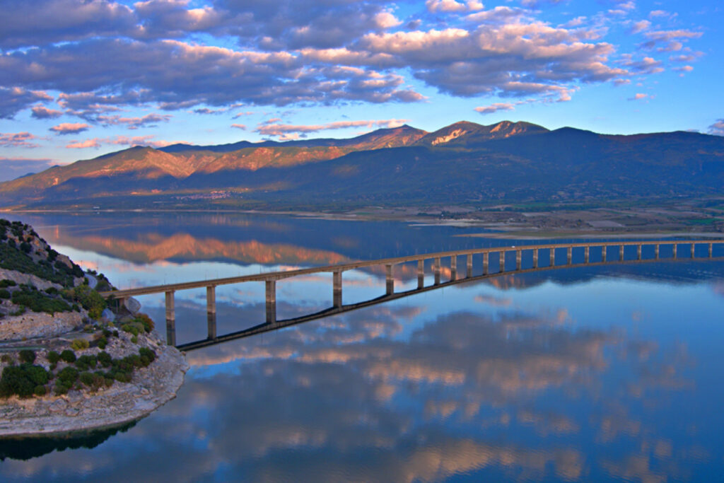 Όταν ξεκίνησαν τα έργα για την κατασκευή της το 1972, η λίμνη δεν είχε πάρει ακόμα το τελικό της σχήμα, με αποτέλεσμα τα πέδιλα από τις 27 γιγάντιες κολώνες της, να χτιστούν σε στέρεο έδαφος όπως και η θεμελίωσή της. Το τοξωτό της σχήμα μα και το κενό εσωτερικό των στηλών της, αποτέλεσαν στοιχείο ασφάλειας και σταθερότητας, σε σχέση μάλιστα με όλες τις προηγούμενες γέφυρες που το μήκος τους δεν ξεπερνούσε τα 250μ και ήταν ευθύγραμμες.