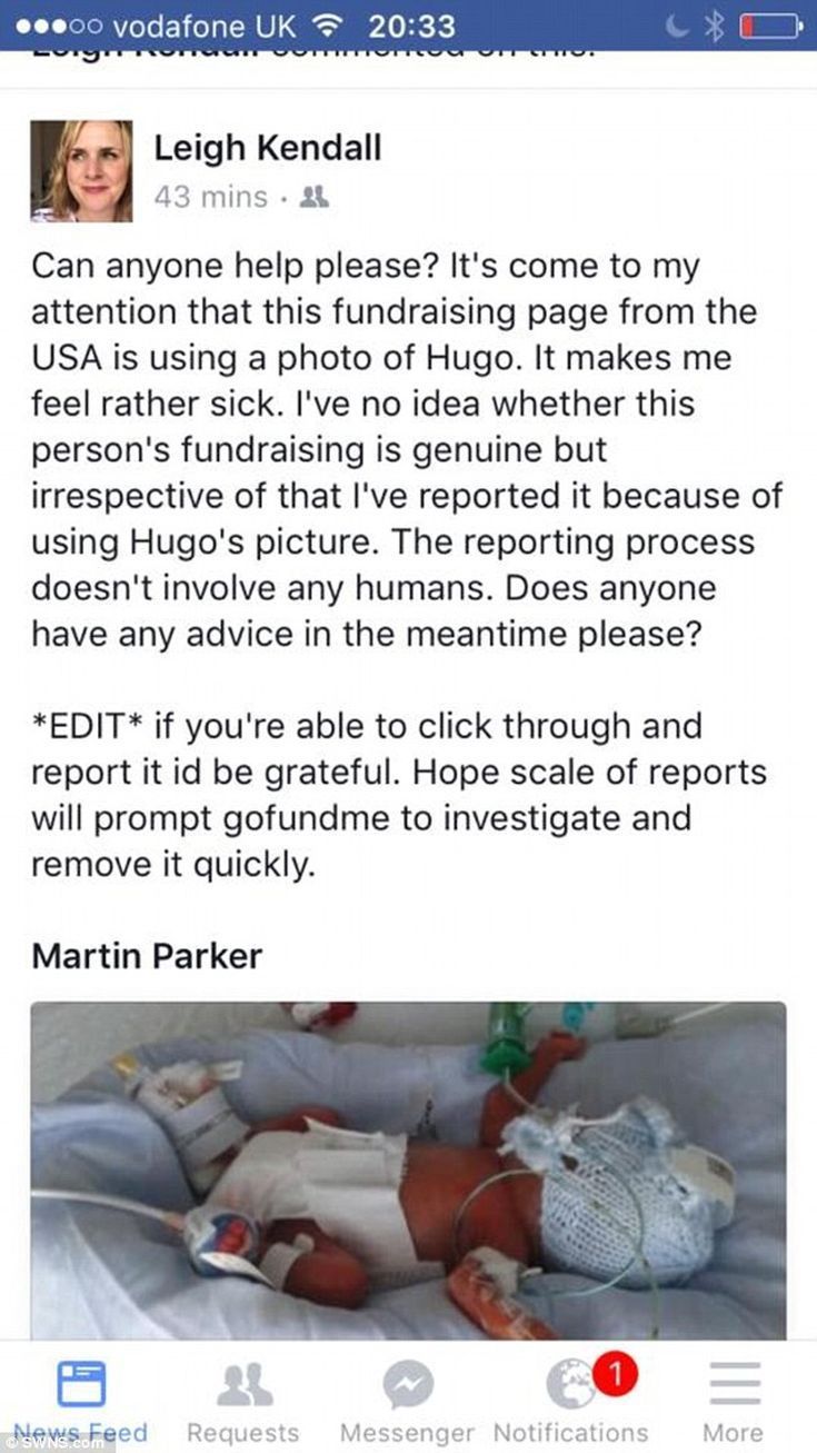 Όμως, δύο χρόνια μετά, η Leigh ήρθε σε επαφή με μια γυναίκα από την Αμερική μέσω του Facebook, η οποία την προειδοποίησε ότι η φωτογραφία του Hugo είχε χρησιμοποιηθεί σε μια σελίδα συλλογής χρημάτων σε μορφή εράνου από μια γυναίκα που ισχυριζόταν ότι χρειάζεται 10.000 λίρες για τη διαμονή και τα ιατρικά έξοδα για το γιο της στη Βιρτζίνια των ΗΠΑ.