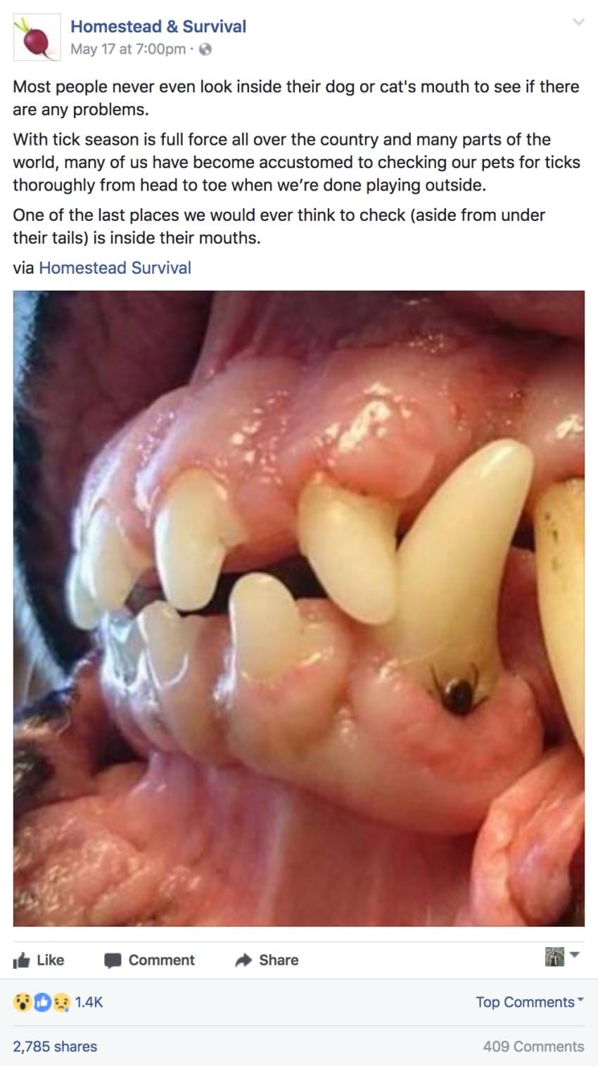 Όταν οι άνθρωποι ελέγχουν τους τετράποδους φίλους τους για τσιμπούρια, συχνά κάνουν ένα διεξοδικό έλεγχο στο σώμα τους, αλλά ξεχνούν να ελέγξουν ένα πολύ σημαντικό σημείο: το στόμα του σκύλου! Η Homestead & Survival μοιράστηκε την παρακάτω φωτογραφία στη σελίδα της στο Facebook. Η φωτογραφία έχει κοινοποιηθεί πάνω από 2.700 φορές!