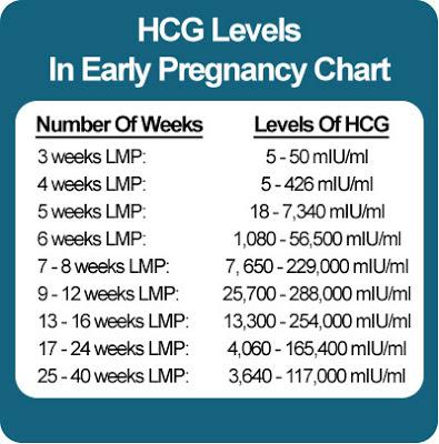3 εβδομάδες: 5 – 50 mIU / ml 4 εβδομάδες: 5 – 426 mIU / ml 5 εβδομάδες: 18 – 7.340 mIU / ml 6 εβδομάδες: 1.080 – 56.500 mIU / ml 7 – 8 εβδομάδες: 7, 650 – 229.000 mIU / ml 9 – 12 εβδομάδων: 25.700 – 288.000 mIU / ml 13 – 16 εβδομάδων: 13.300 – 254.000 mIU / ml 17 – 24 εβδομάδων: 4.060 – 165.400 mIU / ml 25 – 40 εβδομάδων: 3.640 – 117.000 mIU / ml Αρνητικό τεστ εγκυμοσύνης: <5,0 mIU / ml Γυναίκες μετά την εμμηνόπαυση: <9,5 mIU / ml