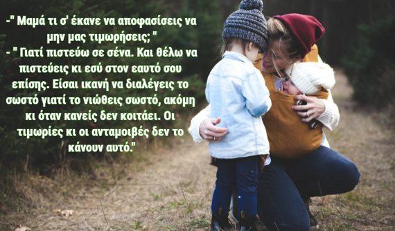 -” Μαμά τι σ’ έκανε να αποφασίσεις να μην μας τιμωρήσεις; ” – ” Γιατί πιστεύω σε σένα. Και θέλω να πιστεύεις κι εσύ στον εαυτό σου επίσης. Είσαι ικανή να διαλέγεις το σωστό γιατί το νιώθεις σωστό, ακόμη κι όταν κανείς δεν κοιτάει. Οι τιμωρίες κι οι ανταμοιβές δεν το κάνουν αυτό.”