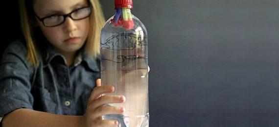Όταν, λοιπόν, θα έχετε πετύχει την ιδανική πλευστότητα, γεμίστε μέχρι πάνω ένα πλαστικό μπουκάλι νερού με το νερό που είχατε στο προηγούμενο δοχείο. Στη συνέχεια βάλτε μέσα το υποβρύχιό σας και κλείστε το μπουκάλι με το καπάκι του. Έπειτα πιέστε το μπουκάλι στο κέντρο του. Καθώς το πιέζετε το υποβρύχιό σας θα πρέπει να βυθίζεται μέσα στο μπουκάλι, ενώ αφήνοντάς το θα ανεβαίνει πάλι στην επιφάνεια. Αν δεν συμβεί αυτό τότε θα πρέπει να ελέγξετε μήπως από κάπου μπαίνει αέρας στο καλαμάκι ή δοκιμάστε να το επαναλάβετε με λίγο πιο ζεστό νερό. Βάλτε και το άλλο υποβρύχιο μέσα στο μπουκάλι και συνεχίστε το παιχνίδι!