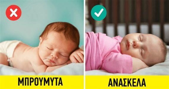 - Τα μωρά πρέπει να κοιμούνται ανάσκελα. Από το 1992, όταν μια επίσημη σύσταση άλλαξε από το “ύπνος μπρούμυτα” στο “ύπνος ανάσκελα”, το ποσοστό θνησιμότητας από το σύνδρομο αιφνίδιου βρεφικού θανάτου (SIDS) στις χώρες της Δυτικής Ευρώπης μειώθηκε 3 φορές.