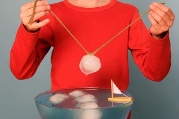 Η εξήγηση : Όταν το αλάτι αγγίζει το παγάκι, θερμαίνει ένα μικρό μέρος του. Μέσα σε 5-10 λεπτά, το αλάτι διαλύεται στο νερό, ενώνοντας το πάγο και το νήμα.