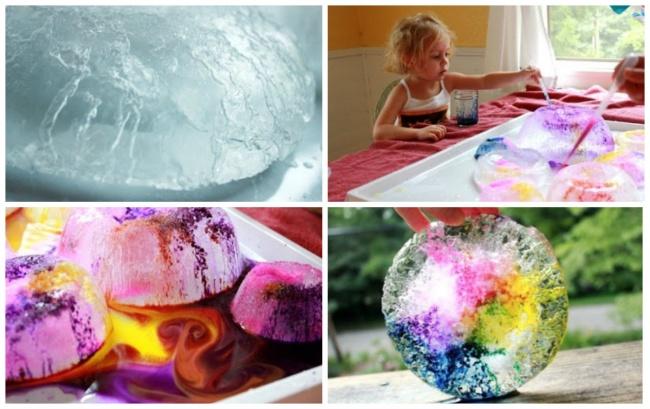 Πείραμα: Το βράδυ, ετοιμάστε μερικά παγάκια σε δίσκους πάγου ή σε διάφορα κύπελλα και μπολ. Την επόμενη μέρα, ετοιμάστε μερικά ισχυρά διαλύματα αλατιού σε διάφορα δοχεία και προσθέστε κάποια χρώματα σε αυτά. Τοποθετήστε τα παγάκια στο δίσκο και χρησιμοποιώντας μια πιπέτας ή ένα κουταλάκι του γλυκού, τοποθετήστε μερικά σταγονίδια του διαλύματος αλατιού πάνω τους. Το αλάτι θα διαλύσει τον πάγο, κάνοντας μικρές τρύπες σε αυτό, και το χρώμα θα δημιουργήσει όμορφα σχέδια μέσα στους πάγους.