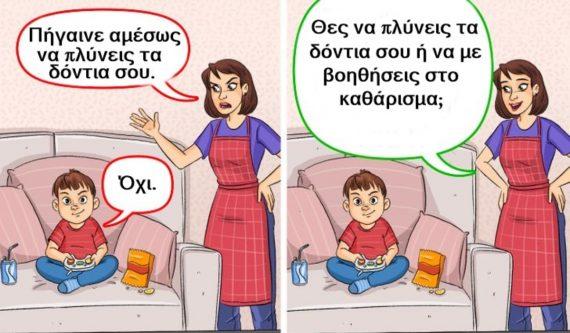 Όταν ένα παιδί αντιδράει μπροστά στα αιτήματά σας είναι καλό πολλές φορές να του κάνουμε την εύλογη ερώτηση “τι θα ήθελες να κάνεις δηλαδή;” ή “τι θα μπορούσα να κάνω καλύτερα;” με ήρεμο τρόπο. Έτσι το παιδί μπορεί στο τέλος να συμφωνήσει και μαζί σας ή να σας δώσει μία ακόμη πιο έξυπνη ιδέα.