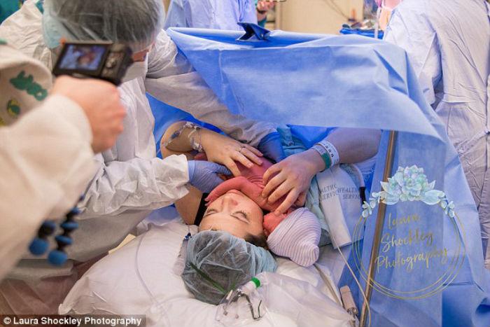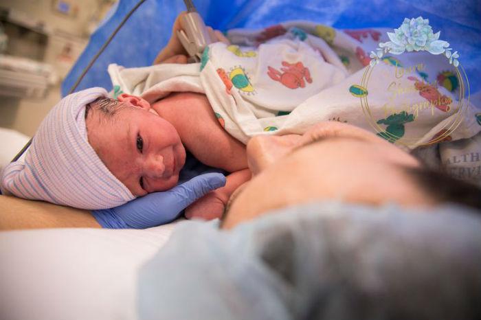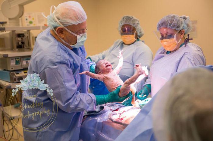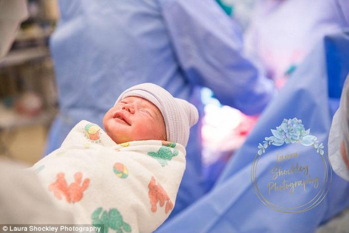 Η απίστευτη στιγμή απαθανατίστηκε απ’ την φωτογράφο Laura Shockley. «Σκέφτηκα ότι ήταν τόσο αστείο γιατί θα ήταν έτσι στην κοιλιά μου», είπε η Taylor. «Του είπαμε πως θα είχε πολύ περισσότερο χώρο όταν βγει απ’ την κοιλιά μου για να τεντωθεί κι έκανε ακριβώς αυτό μόλις γεννήθηκε!».
