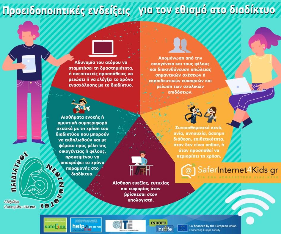 💫Αδυναμία του ατόμου να σταματήσει τη δραστηριότητα, ή ανεπιτυχείς προσπάθειες να μειώσει ή να ελέγξει το χρόνο ενασχόλησης με το διαδίκτυο. 💫Απομόνωση από την οικογένεια και τους φίλους και διακινδύνευση απώλειας σημαντικών σχέσεων ή εκπαιδευτικών ευκαιριών και μείωση των σχολικών επιδόσεων. 💫Αισθήματα ενοχής ή αμυντική συμπεριφορά σχετικά με τη χρήση του διαδικτύου που μπορούν να εκδηλωθούν και με ψέματα προς μέλη της οικογένειας ή φίλους, προκειμένου να αποκρύψει το χρόνο παραμονής στο διαδίκτυο. 💫Συναισθηματικό κενό, ανία, ανησυχία, άσχημη διάθεση, επιθετικότητα, όταν δεν είναι online, ή όταν προσπαθεί να περιορίσει τη χρήση. 💫Αίσθηση ευεξίας, ευτυχίας και ευφορίας όταν βρίσκεσαι στον υπολογιστή.