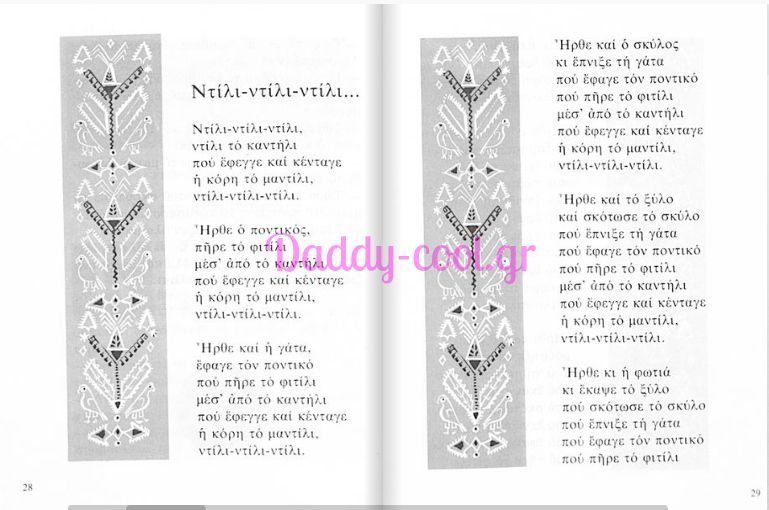 Ήρθε ο ποντικός, πήρε το φιτίλι μέσ’ από το καντήλι που έφεγγε και κένταγε η κόρη το μαντίλι, ντίλι-ντίλι-ντίλι.