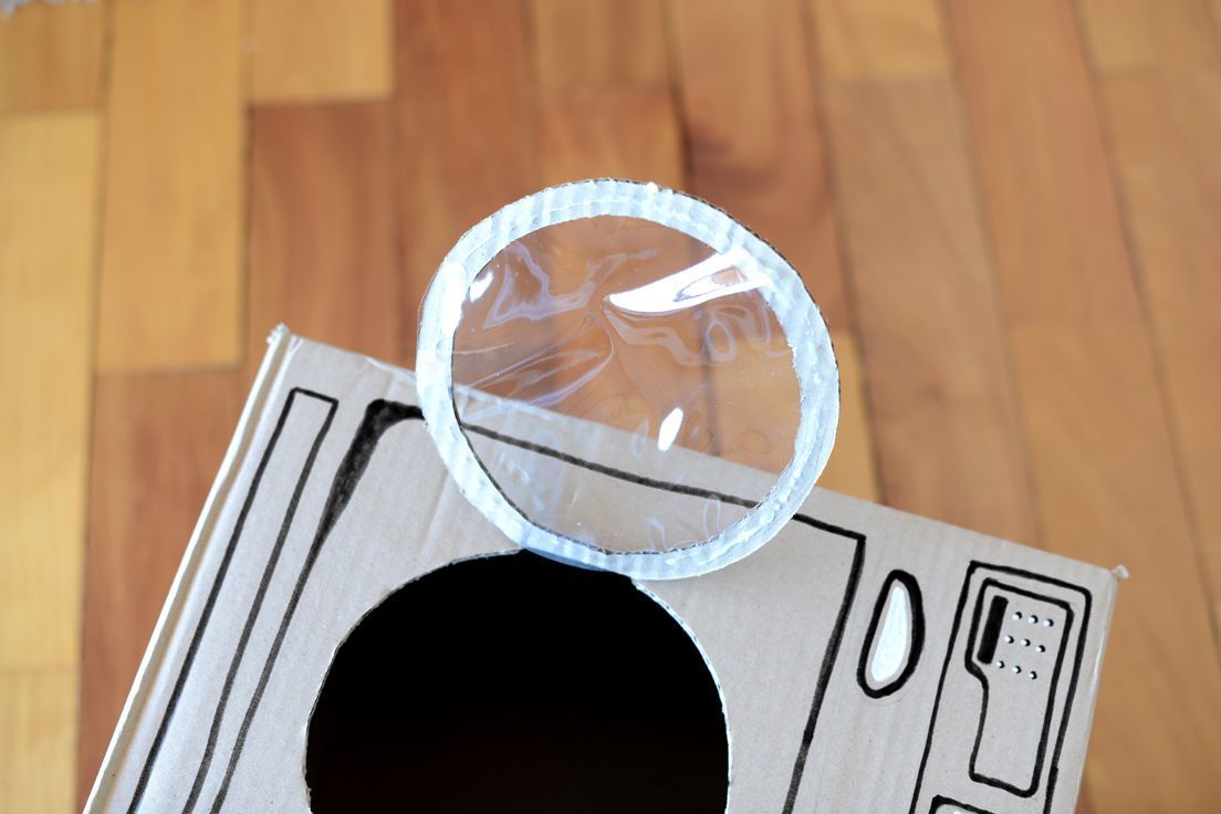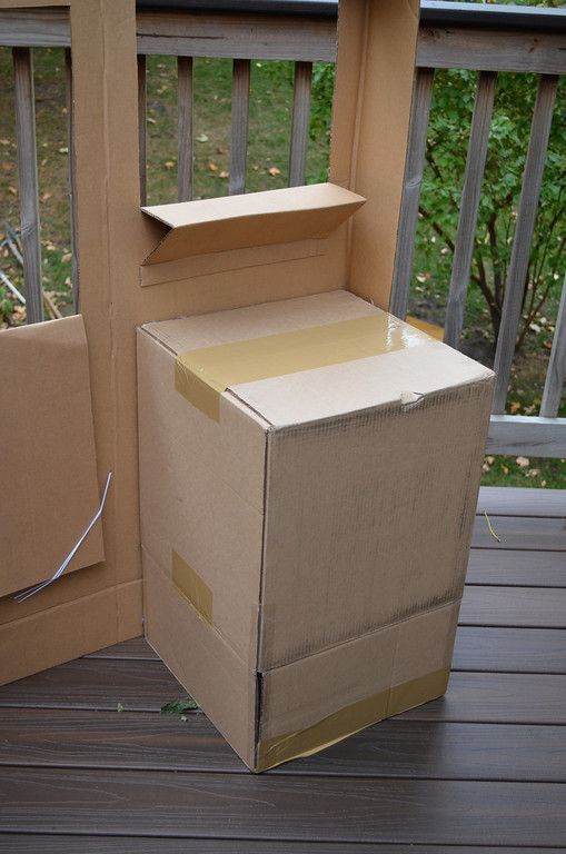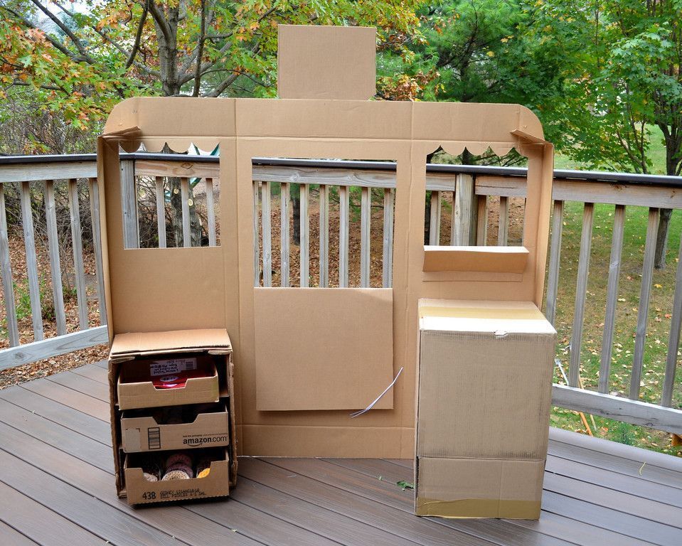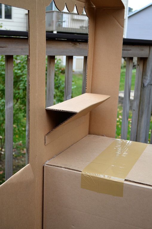 και στη συνέχεια κολλήστε δύο κουτιά στην πίσω πλευρά του. Αυτά τα κουτιά είναι η σταθεροποίηση του μπροστινού τμήματος. Με τον τρόπο αυτό το μεγάλο κομμάτι χαρτόνι δεν θα πέσει κάτω.