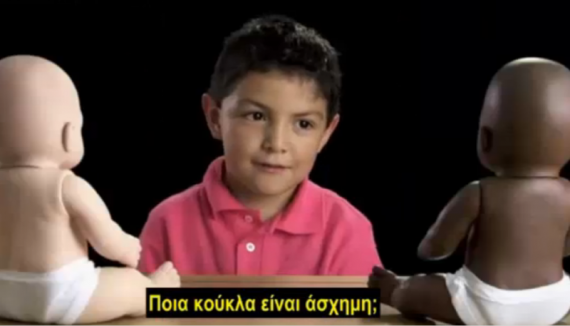 Ένα παιδί σε ένα δωμάτιο με δύο κούκλες: η μία με λευκό δέρμα και η άλλη με μαύρο. Ένας ερευνητής κάνει ερωτήσεις.