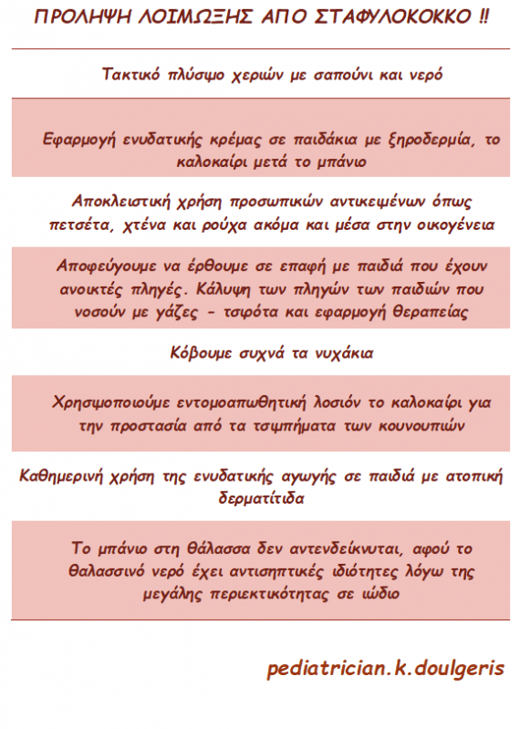Βρήκαμε λοιπόν στην επίσημη σελίδα του Κυριάκου Δουλγέρη στο Facebook τα μέτρα πρόληψης που πρέπει να παίρνουμε από τον σταφυλόκοκκο το Καλοκαίρι. Επίσης, μας έδωσε χρήσιμες πληροφορίες για το πως μπορουμε να αντιμετωπίσουμε τον σταφυλόκοκκο σε περίπτωση που το παιδί νοσήσει.