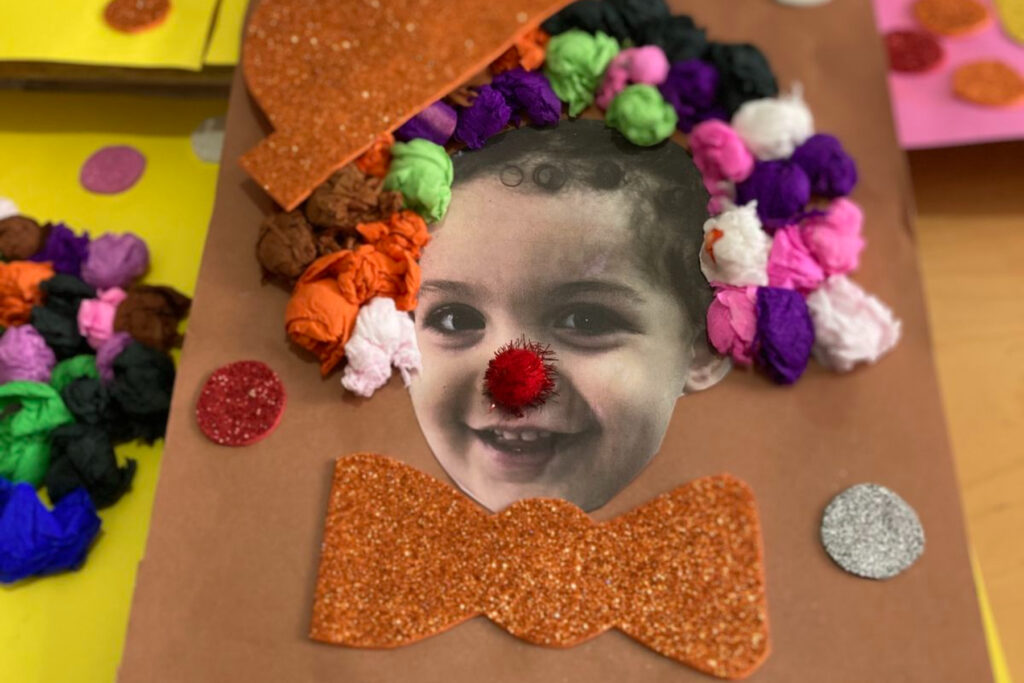 Στη συνέχεια εκτύπωσε τη φωτογραφία και κοψ’ την με τέτοιο τρόπο που να φαίνεται μόνο το κεφάλι του παιδιού. Κόλλησέ την πάνω σε ένα λευκό χαρτόνι και διακόσμησε τη κάρτα με χαρτοπόλεμο, καπελάκι clown που θα φτιάξεις από χαρτόνι, φιόγκους και ό,τι άλλο αγαπάς εσύ και το παιδί.
