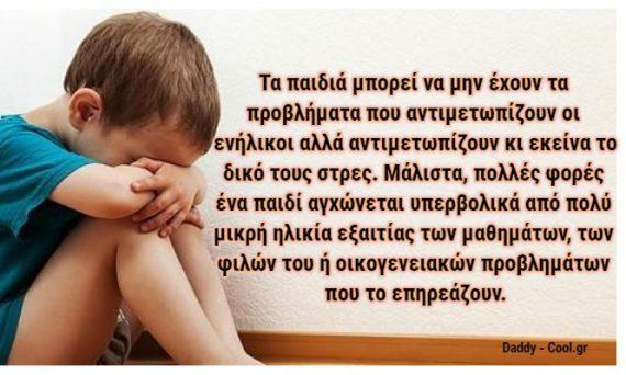 Τα παιδιά μπορεί να μην έχουν τα προβλήματα που αντιμετωπίζουν οι ενήλικοι αλλά αντιμετωπίζουν κι εκείνα το δικό τους στρες. Μάλιστα, πολλές φορές ένα παιδί αγχώνεται υπερβολικά από πολύ μικρή ηλικία λόγω των μαθημάτων, των φίλων του ή οικογενειακών προβλημάτων που το επηρεάζουν. Εξαιτίας της ηλικίας τους όμως, πολλές φορές είναι δύσκολο να αναγνωρίσουμε πότε ένα παιδί έχει στρες ή πότε είναι άπλα κακοδιάθετο.
