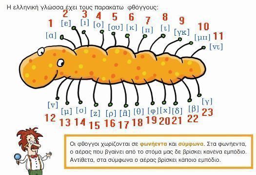 Θα μπορούσε λοιπόν κάποιος να πιστέψει ότι οι φθόγγοι είναι όσοι και τα γράμματα. Μα δεν είναι έτσι. Με τη σημείωση πως τους φθόγγους τους αναφέρουμε συνήθως μέσα σε αγκύλες όταν θέλουμε να τους “γράψουμε” , πχ [α], [μ] κλπ. (για να τους ξεχωρίζουμε από τα γράμματα) σας παρουσιάζουμε την εξής διαφωτιστική εικόνα από το βιβλίο της Γραμματικής των μεγάλων τάξεων του δημοτικού σχολείου, φροντίζοντας μάλιστα και να τους αριθμήσουμε: