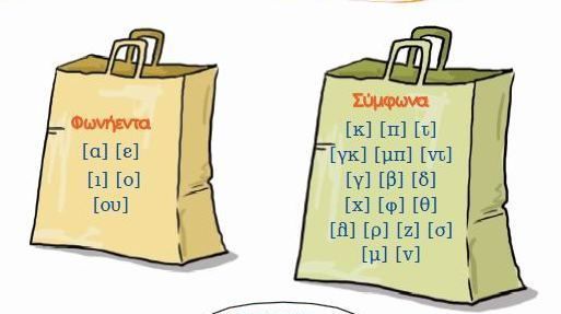 Και τα γράμματα και οι φθόγγοι χωρίζονται σε φωνήεντα και σύμφωνα. Ενώ όμως στα γράμματα ισχύει το περίφημο σχολικό τραγουδάκι: