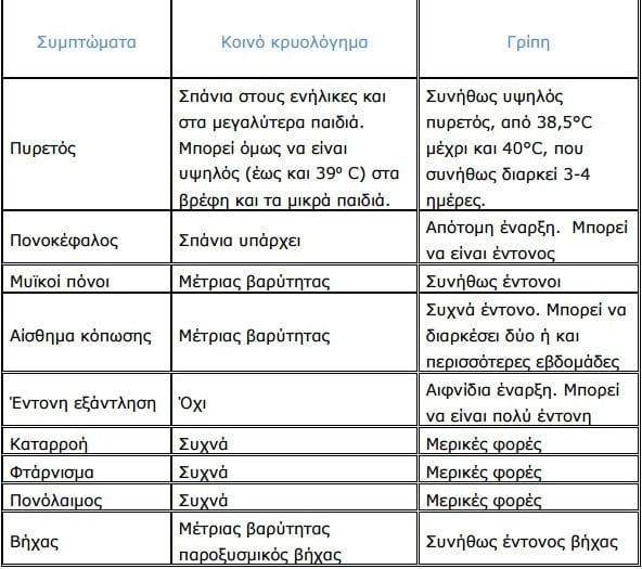 Πολλές φορές ένα σοβαρό κρυολόγημα και μια μέτριας βαρύτητας γρίπη μπορεί να εμφανίζονται με την ίδια περίπου κλινική εικόνα. Στον πίνακα που ακολουθεί φαίνονται οι βασικές διαφορές μεταξύ του κοινού κρυολογήματος και της γρίπης – παρότι τα συμπτώματα αυτά δεν εμφανίζονται πάντα.