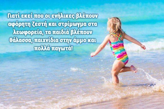 Γιατί εκεί που οι ενήλικες βλέπουν αφόρητη ζεστή και στρίμωγμα στα λεωφορεία, τα παιδιά βλέπουν θάλασσα, παιχνίδια στην άμμο και πολλά παγωτά! Το σημερινό άρθρο είναι για όλους εμάς που μεγαλώνουμε παιδιά.
