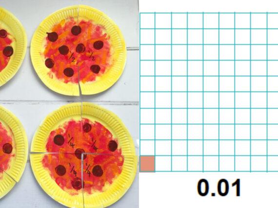 Μπορείτε να φτιάξετε παρέα με το παιδί μία αυτοσχέδια πίτσα από χαρτόνι και να την χωρίσετε σε κομμάτια. Το κάθε κομμάτι θα έχει γραμμένο το αντίστοιχο κλάσμα. Έτσι αν κόψετε την πίτσα στα δύο κάθε κομμάτι θα αντιστοιχεί στο 1/2, αν την κόψετε στα τρία στο 1/3 κοκ.