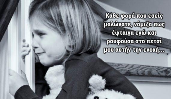 Κάθε φορά που εσείς μαλώνατε, νόμιζα πως έφταιγα εγώ και ρουφούσα στο πετσί μου αυτήν την ενοχή…Κάθε φορά που εσείς μαλώνατε, έχανα τη γη κάτω από τα πόδια μου και το βράδυ έσφιγγα το μαξιλάρι μου από φόβο…