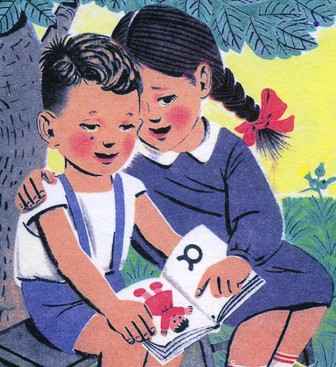 Το πιο διάσημο αναγνωστικό Αν και το Αλφαβητάρι με τον Ήλιο χρησιμοποιήθηκε για σχεδόν 30 χρόνια, το πιο γνωστό και αγαπημένο αναγνωστικό είναι αυτό του 1955. Το «Αλφαβητάριον» που απεικονίζει στο εξώφυλλό του δυο παιδάκια αγκαλιασμένα να διαβάζουν, παρέμεινε στα σχολεία έως το 1974, οπότε το αντικατέστησε, «Η γλώσσα μου». Τα παιδάκια στο εξώφυλλο είναι ντυμένα με την τότε σχολική ενδυμασία, με το χαρακτηριστικό μπλε και άσπρο. Η ποδιά δηλαδή και ο γιακάς, που αντιστοιχούσαν στα χρώματα της ελληνικής σημαίας….