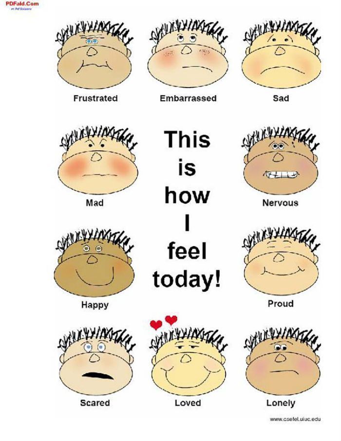 Super tip Μια καλή ιδέα για να μάθει να αναγνωρίζει τα συναισθήματά του, καθώς και εκείνα των άλλων, είναι να το βοηθήσουμε να φτιάξει έναν πίνακα συναισθημάτων με φατσούλες που η καθεμία θα δείχνει από ένα συναίσθημα (βλ. εικόνα παρακάτω). Έτσι όταν νιώθει κάτι μπορεί αρχικά να μας το δείχνει στην εικόνα.