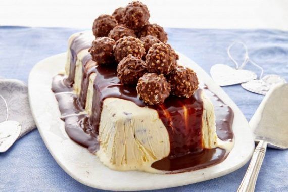 Τι χρειαζόμαστε: κουτί γάλα εβαπορέ (παγωμένο στο ψυγείο) 1 κουτί ζαχαρούχο γάλα (παγωμένο στο ψυγείο) 1 κουτί φυτική σαντιγί, τύπου Μόρφατ (παγωμένη στο ψυγείο) ferrero rocher (όσα θέλουμε) μερέντα (200 γρ) 2 κουταλιές της σούπας λικέρ φουντουκι (προαιρετικα)