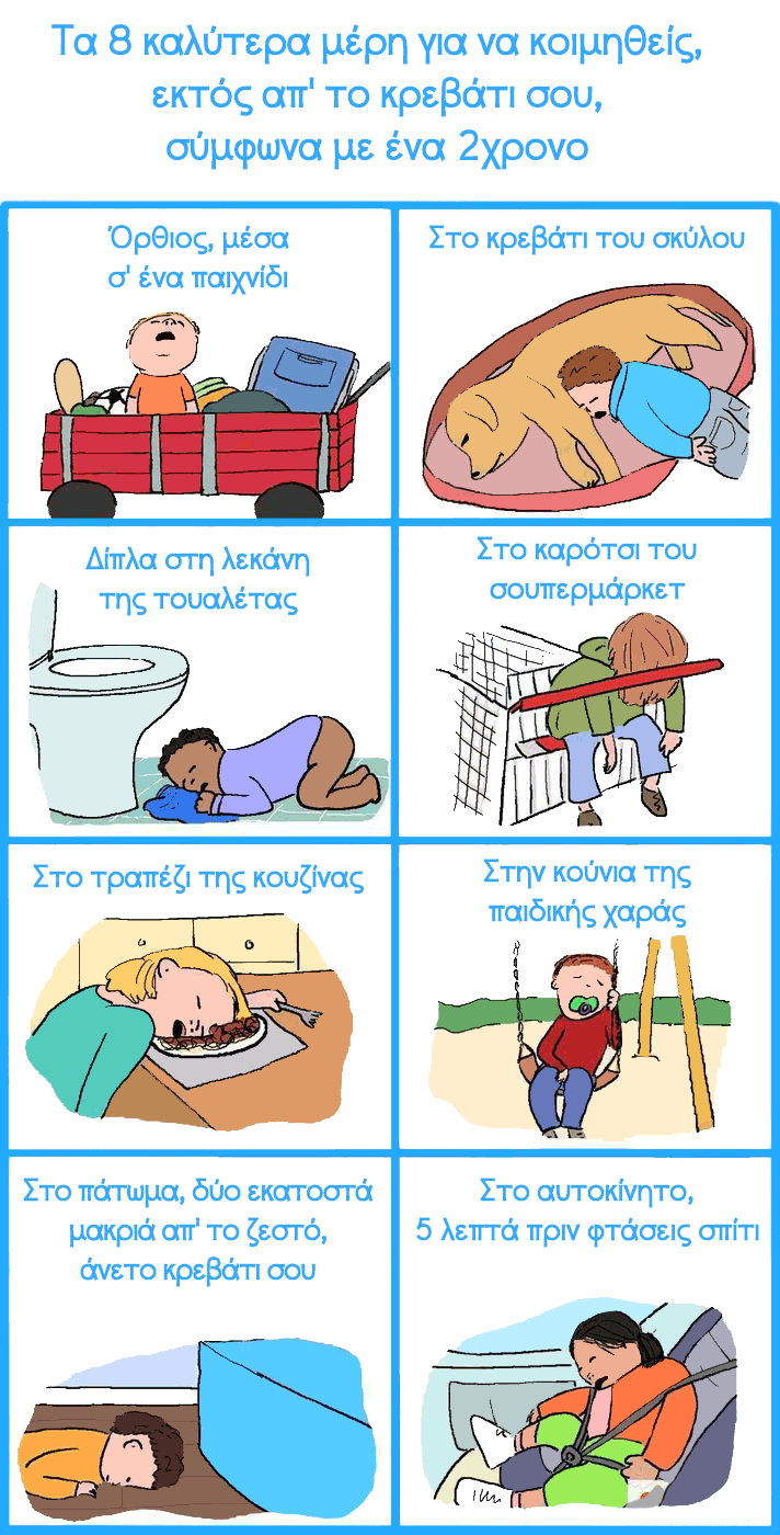 Νομίζετε ότι το αναπαυτικό σας κρεβάτι είναι το καλύτερο μέρος για ύπνο; Ξανασκεφτείτε το. Τα νήπια καταναλώνουν τόση ενέργεια που όταν κάποια στιγμή εξαντλείται, δεν έχουν τη δύναμη να φτάσουν μέχρι το κρεβάτι τους, όπως φαίνεται ξεκάθαρα στο παρακάτω σκίτσο!