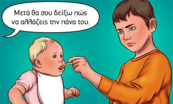 Θα το κατηγορεί που έχασε τις βόλτες του, θα νιώθει ζήλια που πλέον το μικρότερο αδερφάκι δεν έχει τις ευθύνες που είχε αυτό στην ηλικία του και σίγουρα θα φορτώνει εκεί το άγχος που πέρασε κατά την παιδική του ηλικία.