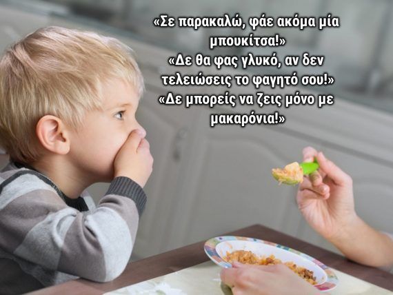 «Σε παρακαλώ, φάε ακόμα μία μπουκίτσα!» «Δε θα φας γλυκό, αν δεν τελειώσεις το φαγητό σου!» «Δε μπορείς να ζεις μόνο με μακαρόνια!» «Μπράβο, είσαι τέλεια! Έφαγες όλο το φαγητό σου…»