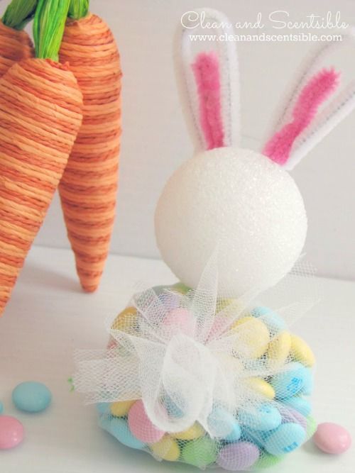- Τοποθετήστε μια μεγάλη χούφτα M & M στη μέση του τούλι. Συγκεντρώστε όλα τα άκρα και στερεώστε τα με ένα μικρό λαστιχάκι. Με αυτό το τρόπο, δημιουργήστε μια ουρά με το τούλι για το λαγουδάκι σας.