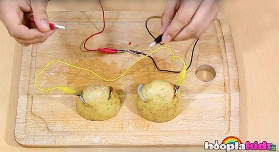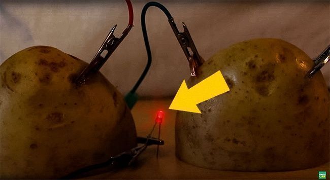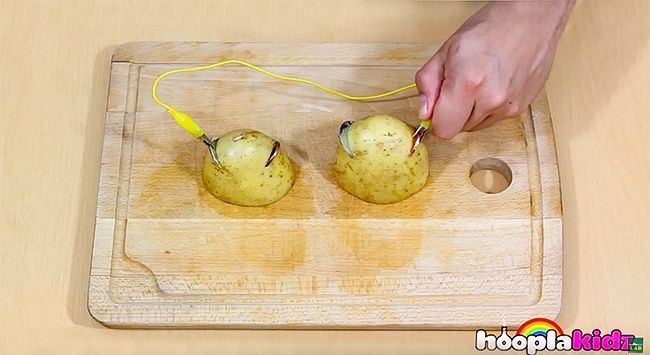 Πως δουλεύει; Ο χυμός πατάτας περιέχει άλατα και οξέα, τα οποία είναι φυσικοί ηλεκτρολύτες. Όταν βάλεις τα νομίσματα και τις ροδέλες στις πατάτες, δημιουργείτε ένταση μεταξύ τους. Εάν συνδέσετε ένα βολτόμετρο στις πατάτες αντί για μια λυχνία LED, μπορείτε να δείτε ότι μία πατάτα παράγει περίπου 0,9 βολτ. Για να κάνετε μόνο μια λυχνία LED να ανάψει, θα χρειαστείτε τάση περίπου 1,7 έως 2 βολτ, ή 2-3 πατάτες.