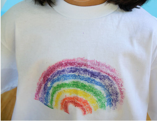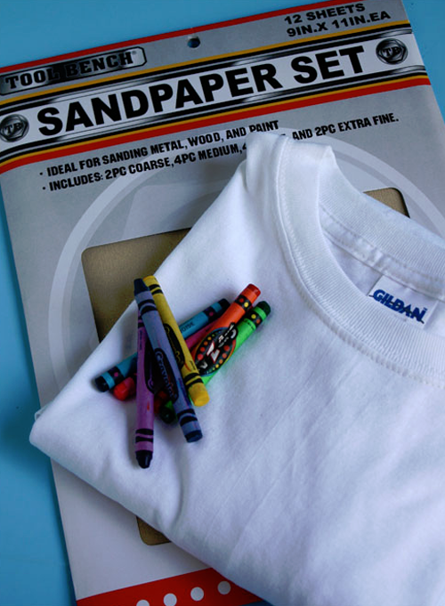 Αρχίστε συγκεντρώνοντας όλα τα υλικά: κηρομπογιές, ένα t-shirt, λεπτό γυαλόχαρτο και ένα σίδερο.
