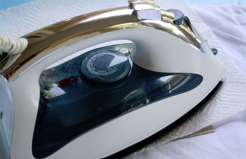 Στη συνέχεια, βάλτε μια χαρτοπετσέτα πάνω στο γυαλόχαρτο και πιέστε πάντα προς τα κάτω με το καυτό σίδερο για περίπου 30 δευτερόλεπτα.
