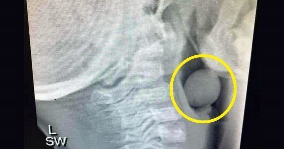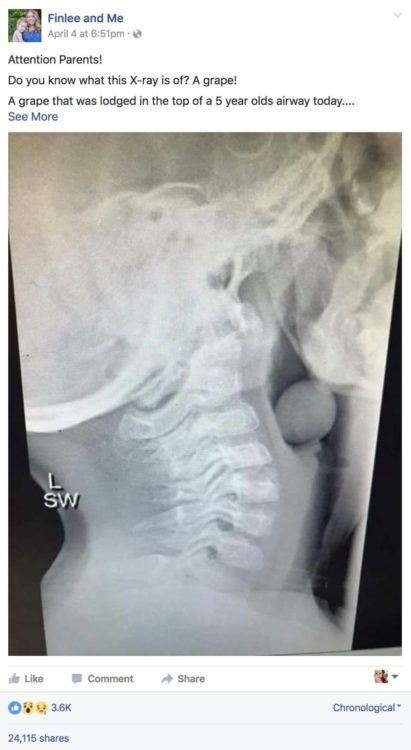 Η Angela έγραψε, «Γονείς Προσοχή! Ξέρετε τι είναι τι δείχνει αυτή η ακτινογραφία; Ένα σταφύλι! Ένα σταφύλι που ”κάθισε” στην κορυφή του αεραγωγού ενός πεντάχρονου αγοριού .»