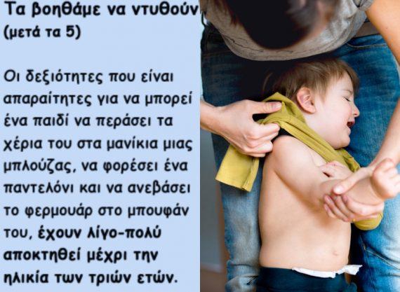 Εννοείται ότι εάν χρειαστεί βοήθεια για να κουμπώσει τα κουμπιά του παντελονιού ,να δέσει τα κορδόνια του η να ανεβάσει το καλσόν του την προσφέρουμε απλόχερα . (Γι αυτό ειδικά θα πρέπει να περιμένετε λίγο μετά τα πέντε χρονιά του παιδιού).Παρόλα αυτά αυτό δεν είναι δικαιολογία για να ντύνουμε εμείς το παιδί.