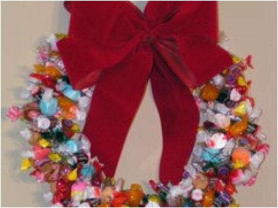- Όταν θα έχετε τελειώσει με την τοποθέτηση όλων των καραμελών ήρθε η ώρα να βάλετε το φιόγκο.Αφού τοποθετήσετε το φιόγκο, βάλτε και μια μικρή κορδέλα στο κάτω μέρος του στεφανιού και περάστε την με ένα ψαλίδι ώστε να τις κάνετε τις χαρακτηριστικές”μπουκλίτσες”!