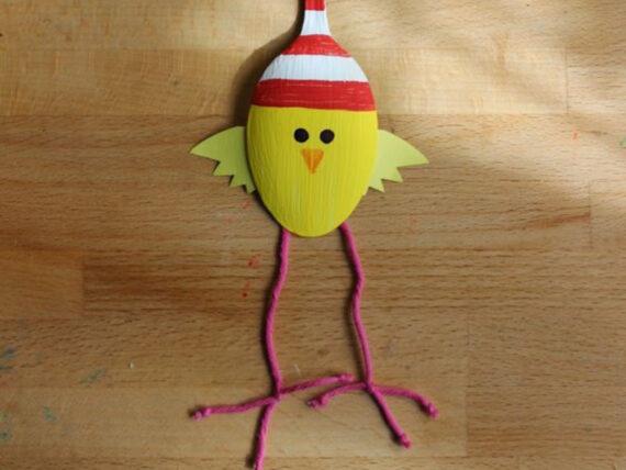 Βάψτε το κουτάλι σας κίτρινο χρώμα και τυπόλοιπο εναλλάξ με κόκκινο και άσπρο και βάλτε στην κορυφή ένα pom pom οτι χρώμα εσείς θέλετε. Στη συνέχεια πάρτε πάρτε ένα μαύρο μαρκαδόρο και κάντε τα μάτια και ένα πορτοκαλί για να κάνετε τη μύτη. Πάρτε χαρτόνι και φτιάξτε 2 μικρά φτερνά και κολλήστε τα στο χαρτόνι. Έπειτα πάρτε 2 μικρά νήματα και σχεδιάστε τα ποδαράκια του κοτόπουλου.