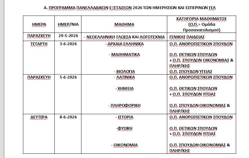 Πρόγραμμα πανελλαδικών εξετάσεων 2026 ημερήσιων και εσπερινών ΓΕΛ