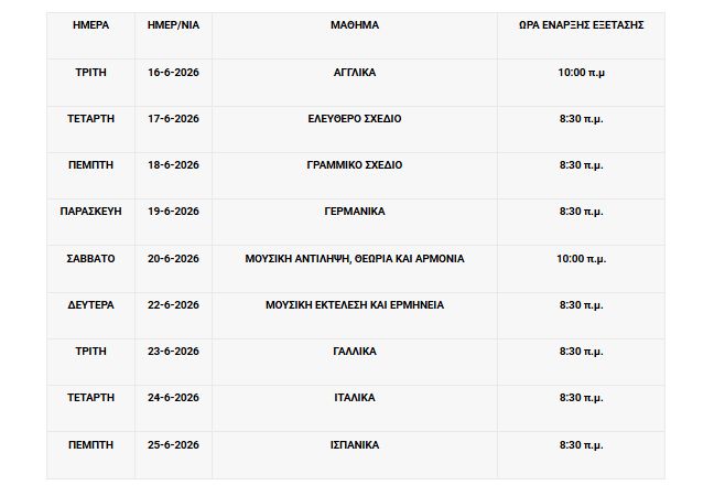 Πρόγραμμα εξετάσεων ειδικών και μουσικών μαθημάτων 2026 ΓΙΑ ΓΕΛ & ΕΠΑΛ