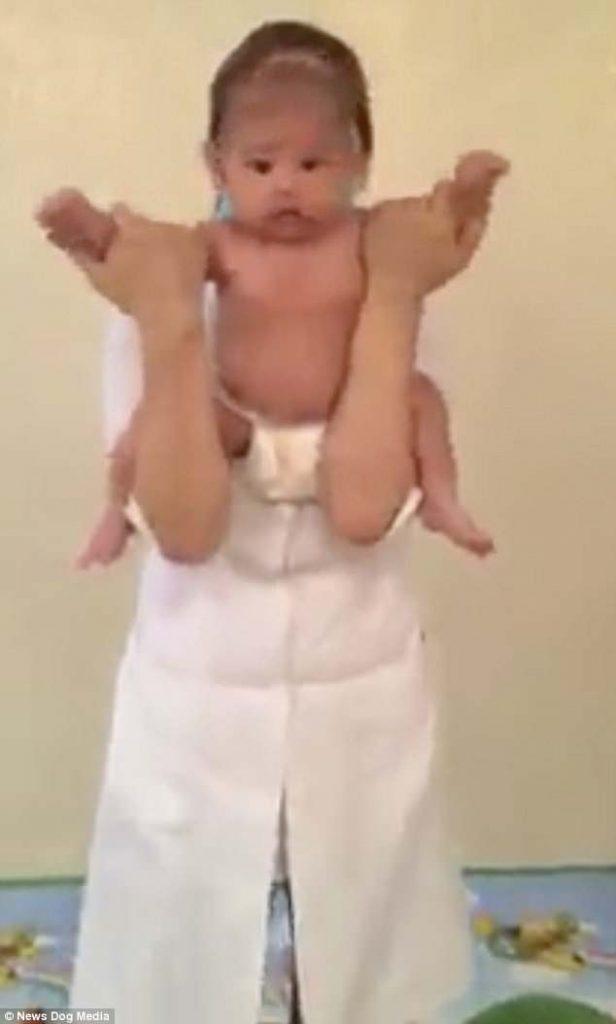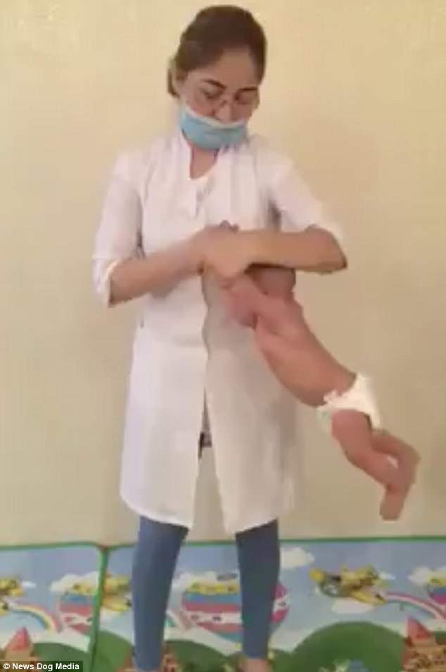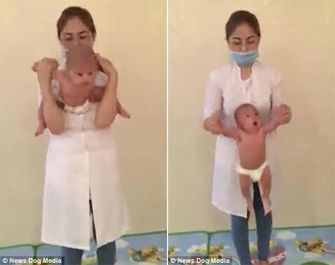 Σε ένα σημείο του βίντεο η γυναίκα που φοράει μια χειρουργική μάσκα πιάνει το μωρό από τον λαιμό και περιστρέφει το σώμα του σε μεγάλους κύκλους.