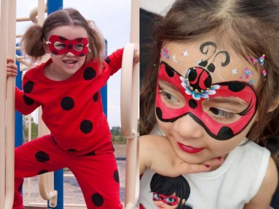 Μπορεί να μην θέλετε ή να μην μπορείτε να φτιάξετε μία μάσκα από χαρτόνι. Γι’ αυτό και παρακάτω θα σας δείξουμε όλες τις ιδέες για αποκριάτικο μακιγιάζ Ladybug με μπογιές για θεατρικό μακιγιάζ, που είναι υποαλλεργικές για παιδιά. Η παρακάτω ιδέα, δεν είναι η παραδοσιακή Ladybug στολή αλλά μπορεί να αρέσει στο παιδί.