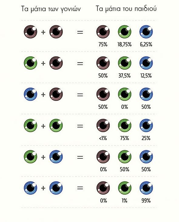 Αν έχετε και οι δύο καφέ μάτια υπάρχει καμία πιθανότητα το παιδί σας να έχει μπλε; Κι αν είστε και οι δύο απ’ τους λίγους και τυχερούς πρασινομάτηδες, υπάρχει περίπτωση το παιδί σας να ατυχήσει και να πορευτεί με το κλασικό καφέ των περισσότερων Νοτιοευρωπαίων; Μελετήστε τον παρακάτω πίνακα και λύστε όλες σας τις απορίες