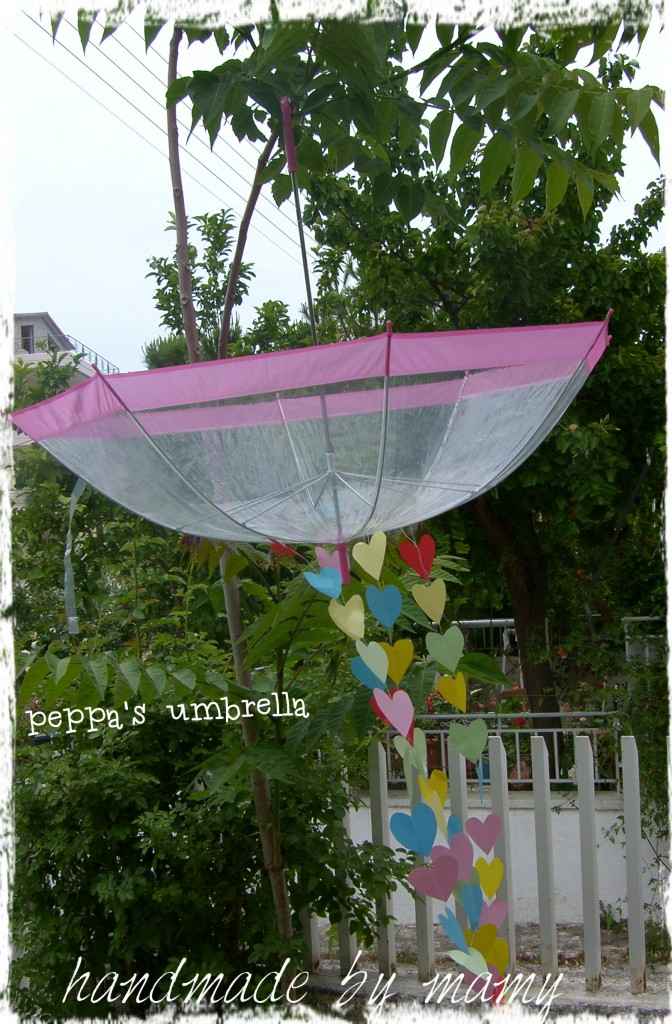 Στην αυλή μια ομπρέλα απο την οποία έπεφτε βροχή απο καρδούλες