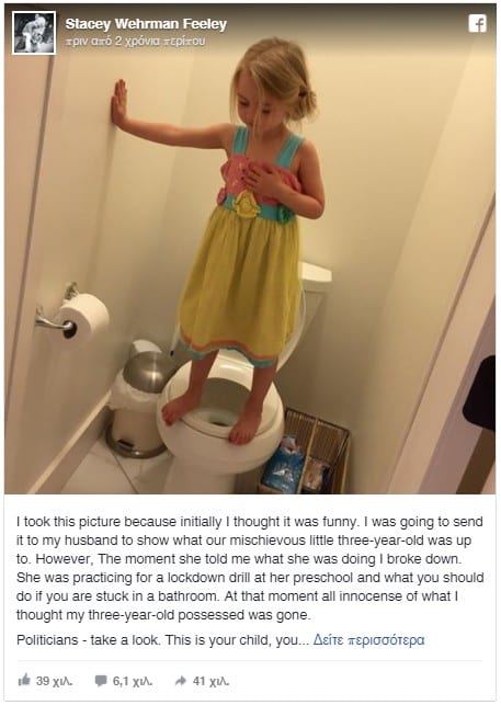 «Τράβηξα αυτή τη φωτογραφία γιατί αρχικά μου φάνηκε αστεία. Σκόπευα να τη στείλω στον άνδρα μου, δείχνοντάς του τι σκάρωνε πάλι η σκανδαλιάρα 3 ετών κόρη μας. Ωστόσο, όταν η ίδια μου εξήγησε τι έκανε… λύγισα. Εξασκούνταν για ενδεχόμενο Lockdown, όπως της είχαν μάθει να κάνει στον παιδικό σταθμό που πήγαινε. Στην άσκηση του σταθμού, έδειξαν στα παιδιά τι πρέπει να κάνουν, σε περίπτωση που ένας δολοφόνος μπει στο σχολείο τους και εκείνα τύχει να βρίσκονται στο μπάνιο. Αυτόματα εκείνη τη στιγμή οποιαδήποτε έννοια αθωότητας πίστευα πως κατείχε η 3χρονη κόρη μου… εξαφανίστηκε.