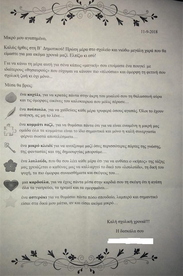 Η εκπαιδευτικός μοίρασε στους μικρούς μαθητές ένα πουγκί που περιείχε ένα κοχύλι, ένα πούπουλο, ένα κομμάτι παζλ, ένα μικρό κλειδί, ένα λουλούδι, μια καρδούλα και ένα αστεράκι. Στο μήνυμά της, η δασκάλα εξηγούσε στα παιδιά την ιδιαίτερη σημασία του κάθε αντικειμένου και σίγουρα τα έκανε να την αγαπήσουν ακόμη περισσότερο.