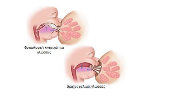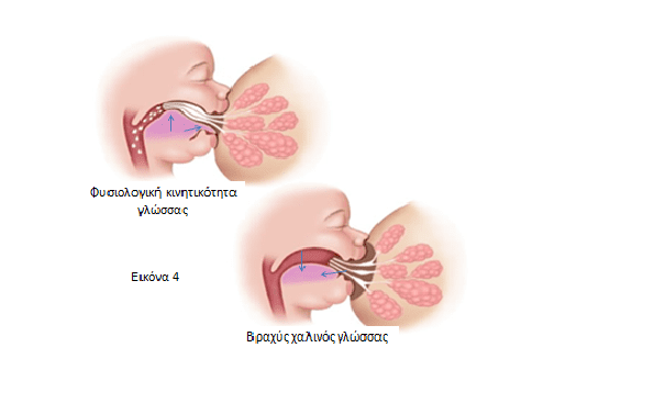 Ο βραχύς χαλινός όμως προκαλεί περιορισμό στην κινητικότητα της γλώσσας τόσο στην προβολή της εκτός των ούλων όσο και στην ανύψωσή της στην υπερώα αποτελεί αιτία ανεπαρκών μηχανισμών θηλασμού, οδηγώντας σε ανεπαρκή ροή γάλακτος και/ή τραύμα των θηλών (Εικόνα 4).