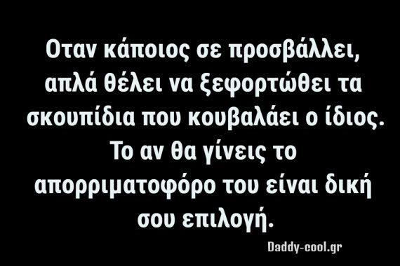 Όταν κάποιος σε προσβάλλει, θέλει να ξεφορτωθεί τα δικά του σκουπίδια. Αυτά που κουβαλάει ο ίδιος στη ψυχή του. Το αν θα γίνεις το απορριμματοφόρο του είναι δική σου και μόνο επιλογή.