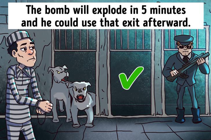 6. Ποια έξοδο πρέπει να επιλέξει; Ένας άντρας φυλακίστηκε, αλλά υπάρχουν 3 τρόποι για να ξεφύγει. Μια έξοδος έχει άγριους σκύλους. Η δεύτερη έχει μια βόμβα με χρονοδιακόπτη 5 λεπτών και είναι ήδη σε λειτουργία. Η τρίτη έχει έναν οπλισμένο φρουρό. Ποια θα πρέπει να επιλέξει;