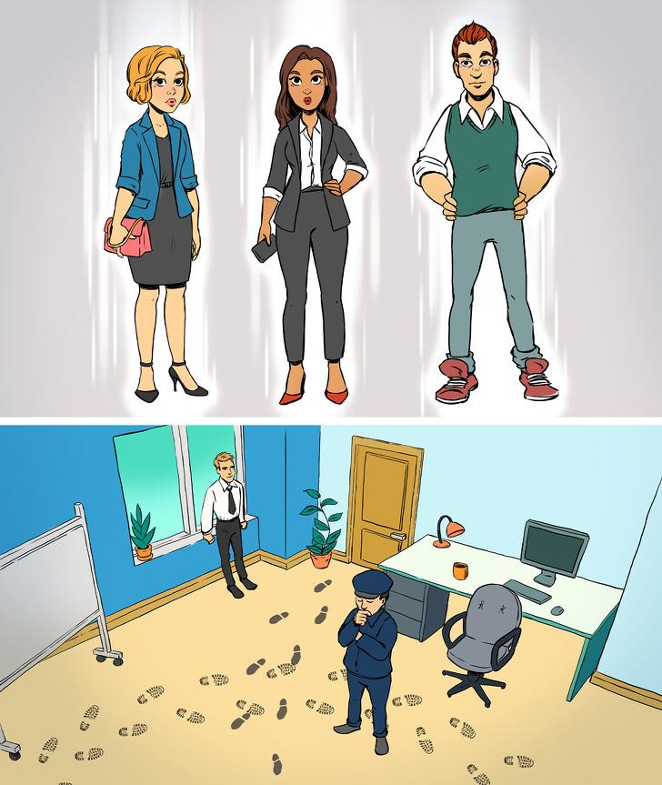 9. Ποιος είναι ο ψεύτης; Ένας επιχειρηματίας έφτασε στο γραφείο του και διαπίστωσε ότι κάποια πολύ σημαντικά έγγραφα είχαν εξαφανιστεί από το γραφείο του. Η αστυνομία υποπτεύεται 3 άτομα και καθένας από αυτούς είπε ότι δεν είχαν πάει καν στο γραφείο. Ποιος λέει ψέμματα;